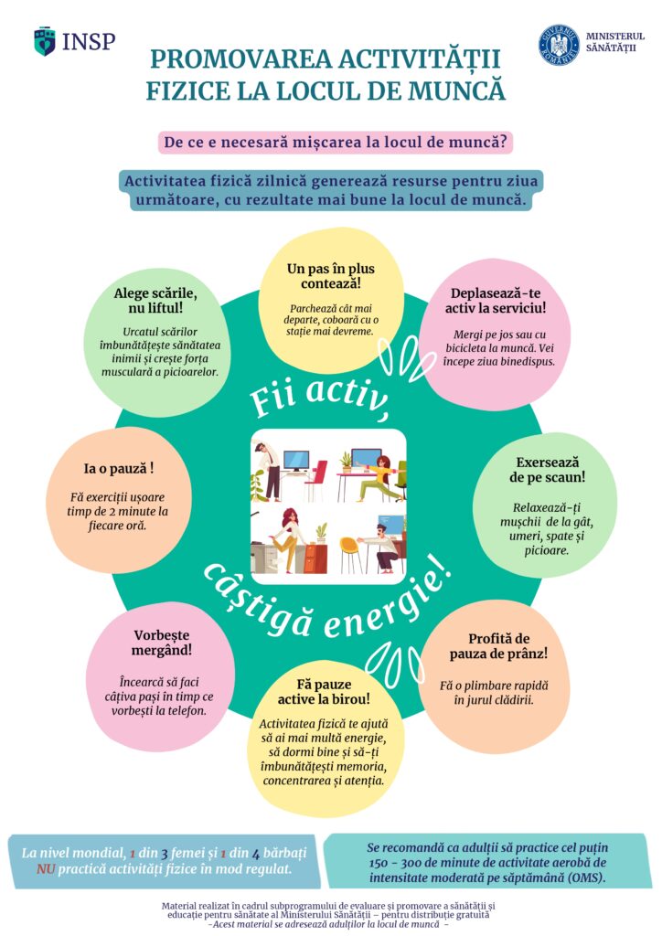 – promovarea activității fizice la locul de muncă pentru angajații cu activitate de birou și promovarea activității fizice în rândul vârstnicilor.